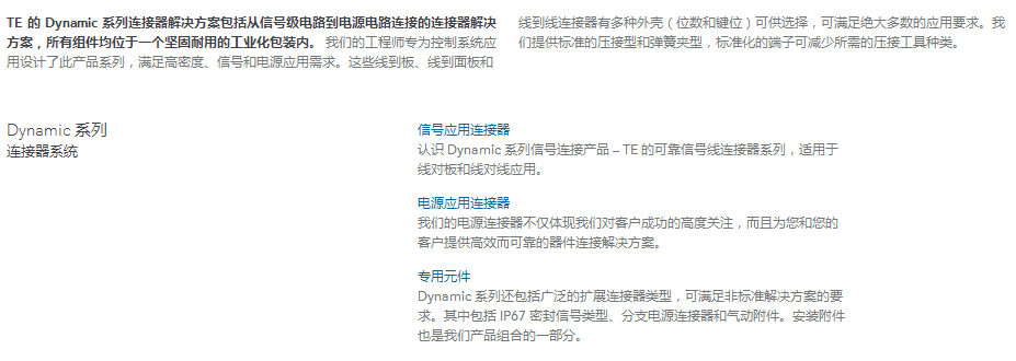 我们的 Dynamic 系列连接器提供灵活的信号和电源解决方案,可满足您的所有控制需求。请下载我们的白皮书,了解 TE 的 Dynamic 系列连接器为何是满足未来工厂效率需求的最佳选择。